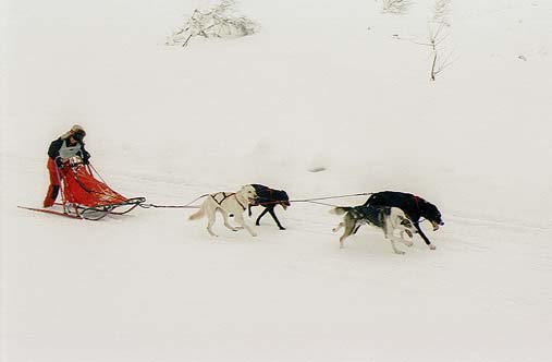 レースに出場される方は写真のように女性のの方もいました。でも素人考えで、犬ぞりはただ乗っているだけで犬が引っ張ってくれるから、 後は方向だけ定めればいいから、女性や子供が適しているかなと考えていました。 ところが、コースは上ったり、下ったりの連続。上りは人間も一緒になって走り、しかも雪の上だから体力勝負。大変なご苦労です。