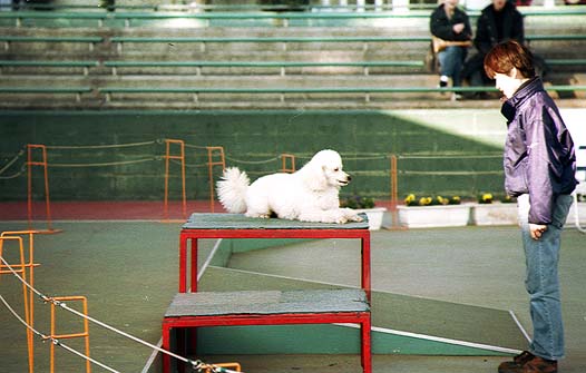 わんわんショーで登場のプードル君です。いきなりお立台の上で大観衆(?)にご挨拶です。 この後10種位のアジリティー軽くこなしていました。ほかにもボーダーコリー君も登場していました。