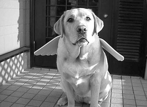 チェリーちゃんは、お祭りに行って来ました。 クタクタになって帰ってきたら、ほら、これつけてって。 よく見えないけど、どうも天使の羽らしい・・・ このウエイトで飛べって?