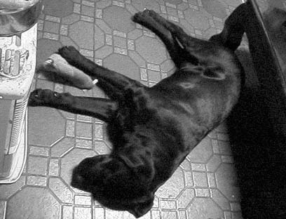 すっすいません、ただ寝ているだけですが、足をのばして寝る犬は珍しいです。しかもストーブの真ん前ですね・・・